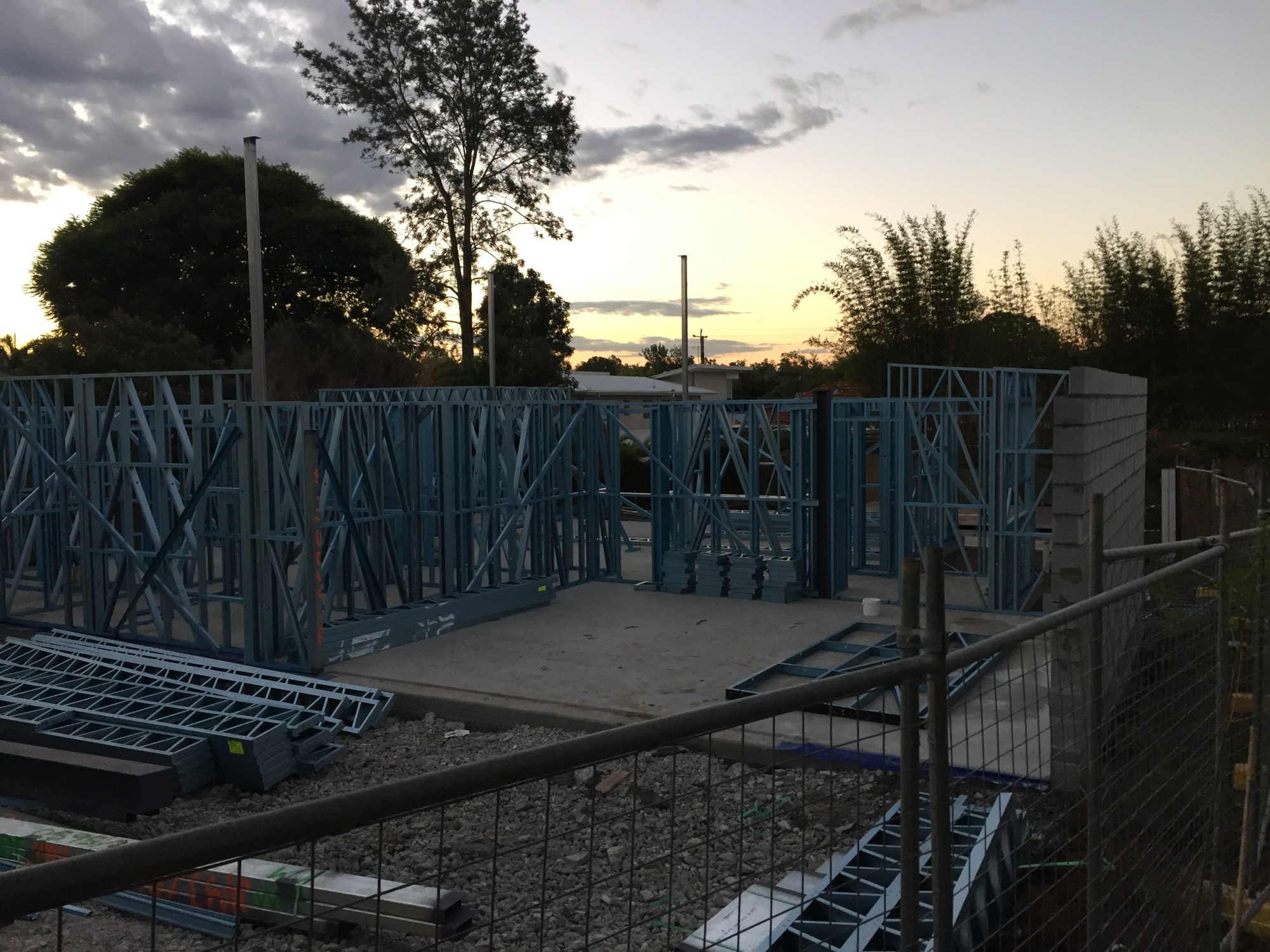 After the slab going down Monday and putting up the boundary blockwall (for the garage that also has a retaining wall element) the framing for the first floor is almost complete! A lot to see in just one week. A fence has now be setup around the site also.
